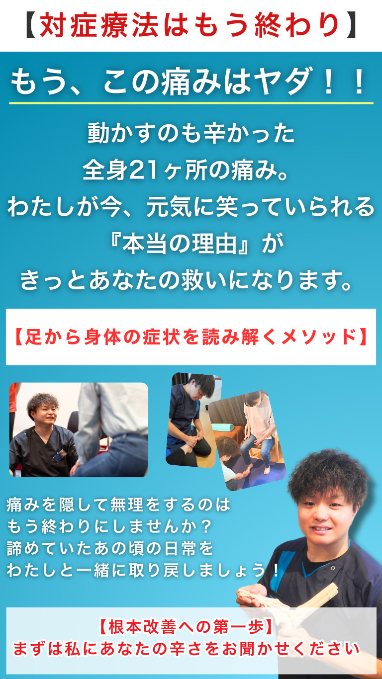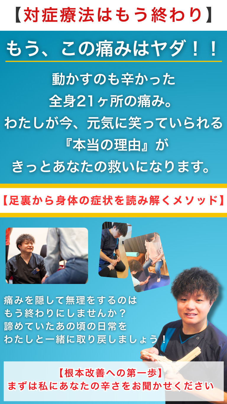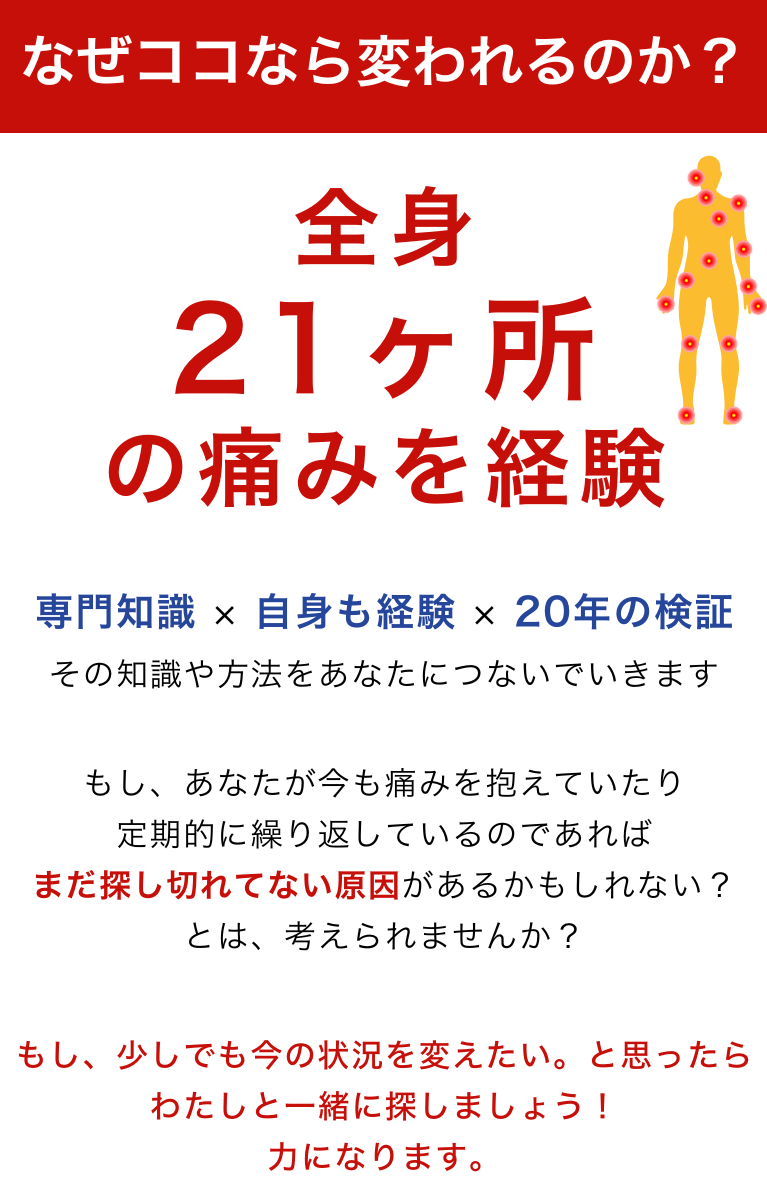 全身17ヶ所痛めた豊富な実体験があるからこそ、痛みに悩む方々の気持ちに深く寄り添い、本当に伝えられることがあると確信しています。