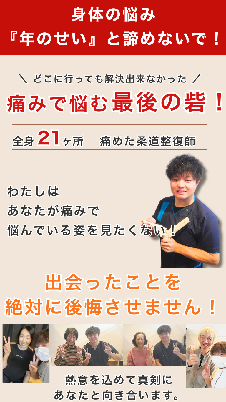 「年のせいだから仕方ない」「毎週通ってマッサージを受けないと不安」 もしあなたが、このような状況で、その場しのぎの治療で何年も苦しんでいるのなら、諦める必要はありません。